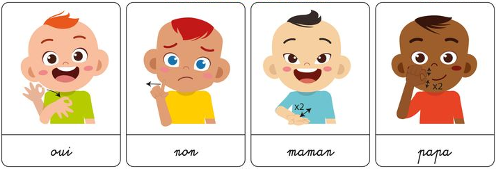 Les signes les plus utilisés à la crèche sont ceux du quotidien : Papa, Maman, s’il te plait, merci, maison, crèche, de l’eau, gâteau, encore...